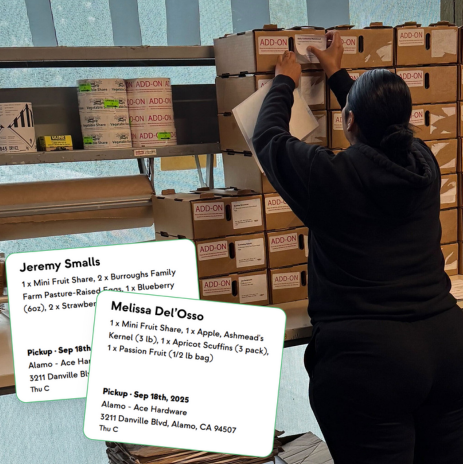 The crew at Frog Hollow knows error-free fulfillment starts before the boxes leave the farm. Add-on boxes are easy to miss when delivered and picked up alongside main shares, so they clearly mark each one with a bold "ADD-ON" label. This visual indication alongside the Signout Sheets assists drivers in dropping the correct orders at each pickup site, while ensuring members only collect the orders meant for them.
