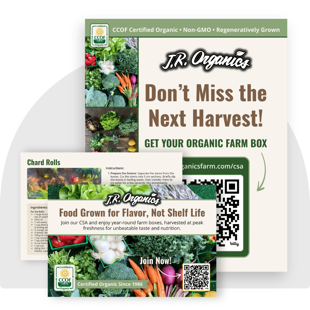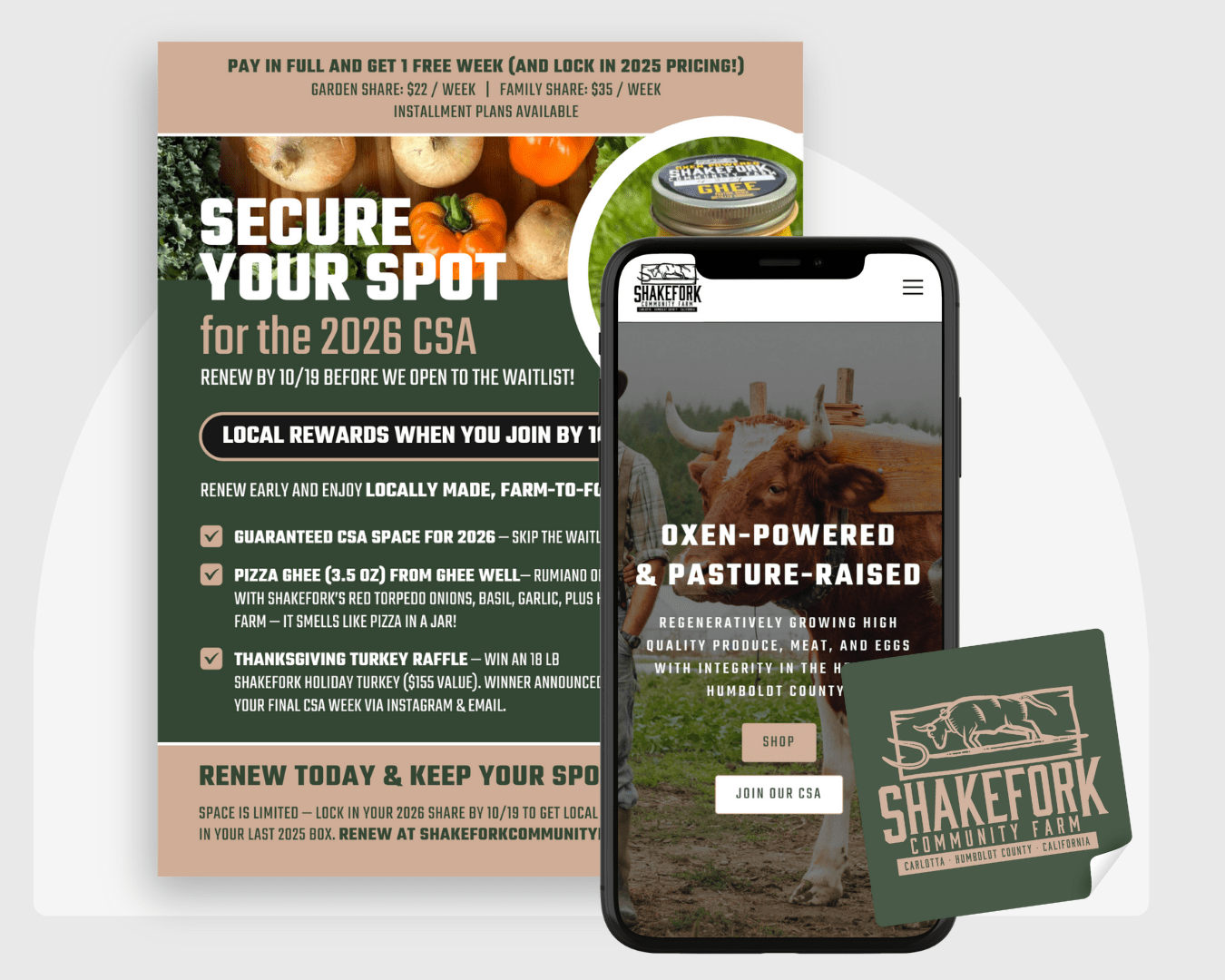 Professional flyers, postcards, social media graphics, and member handbooks—all branded for your farm.